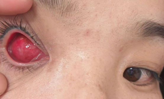 3个月前,眼睛突然开始发红发炎,为了不耽误上班,同时又要照顾小孩,李女士一直忍着没去检查,慢慢的发红越来越严重,眼底开始流血水。